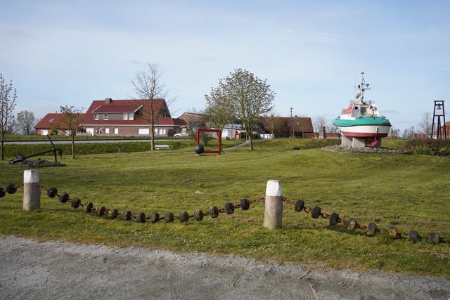 Er wurde so positioniert, dass man im Hintergrund sowohl das Schiff als auch den Rettungsschuppen sieht. Somit sind dann zwei für den Ort typische Objekte mit im Bild.