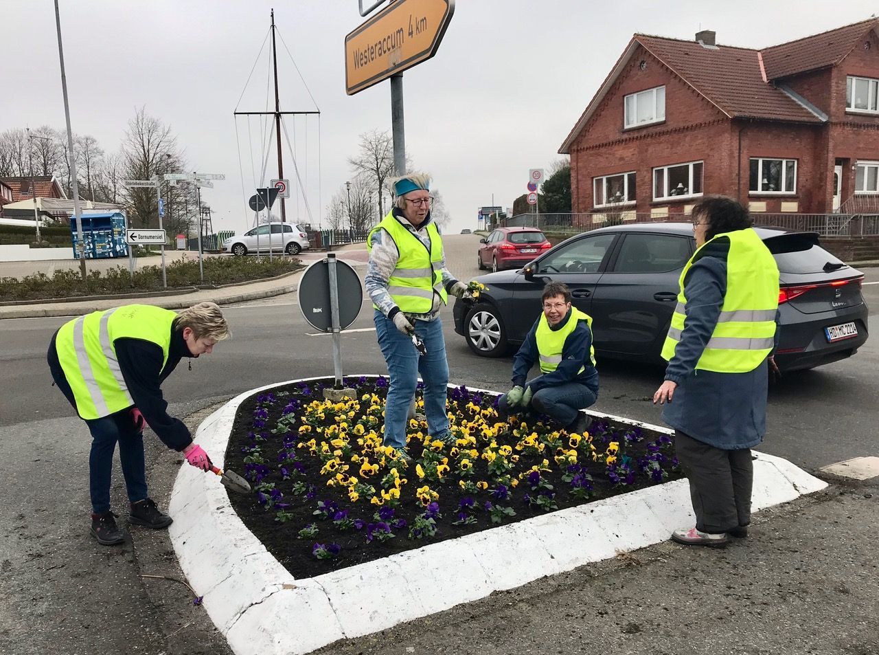 Nachdem unsere Mitglieder im Herbst 2000 Stck. Blumenzwiebeln in den Boden brachten, wurden im März die Verkehrsinsel neu bepflanzt. Wind und Kälte hielten die fleißigen Helfer nicht von ihrem Einsatz ab.