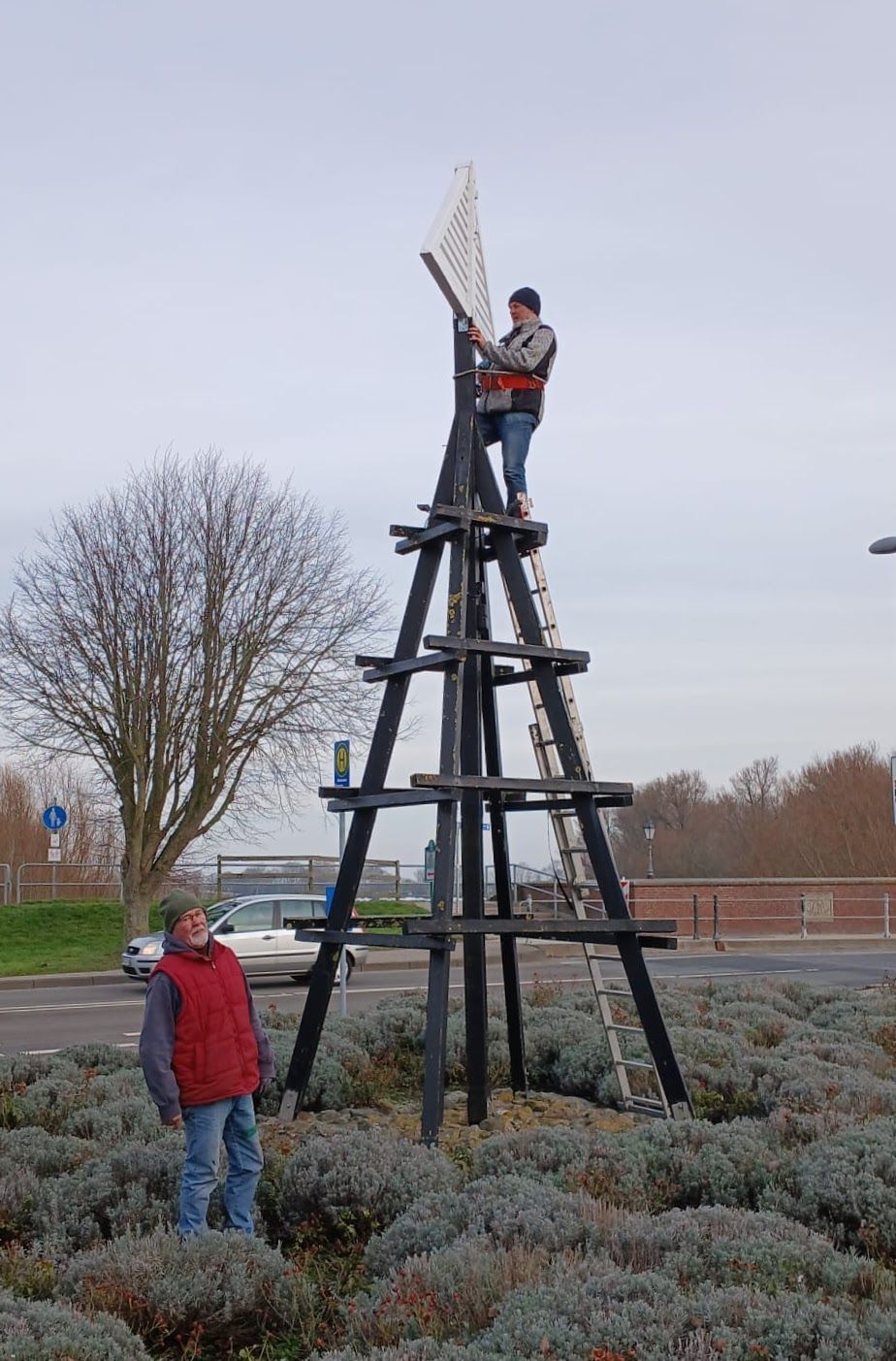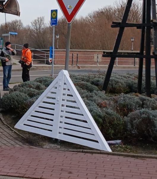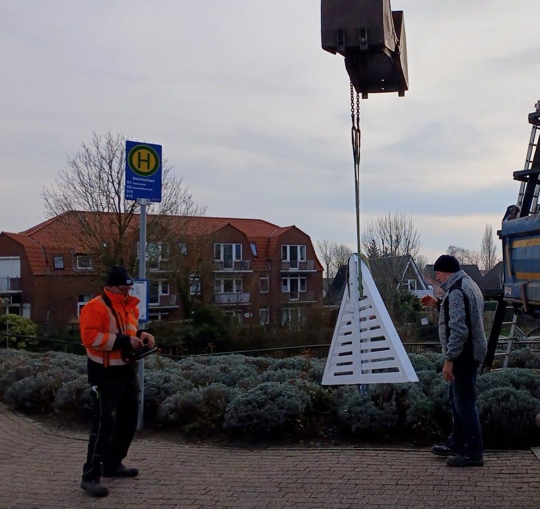 Heute war es dann so weit: Mit vereinten Kräften, handwerklichem Geschick und einer ordentlichen Portion Herzblut haben Martin Lindemann und Ralf von Osten von mit Hilfe der Gemeinde Dornum die Spitze wieder an ihren rechtmäßigen Platz gehievt und fest montiert.